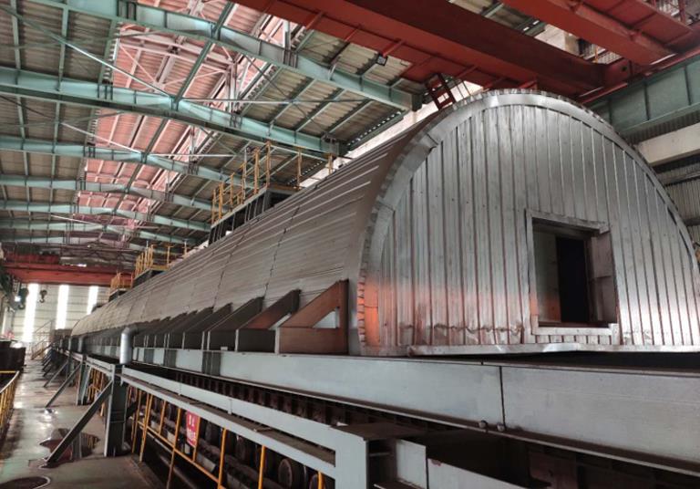 循環(huán)煙氣罩頂部采用隔熱保溫。循環(huán)煙氣罩為10段,每段4m,段與段之間設有膨脹節(jié),以吸收熱膨脹。循環(huán)煙氣罩設有端部密封,密封在循環(huán)煙氣罩頭尾置于臺車欄板的頂面,采用鋼板密封并與臺車欄板頂面留有間隙,為方便觀察,密封罩上設有多個觀察門,同時,當煙氣循環(huán)關閉時,可打開觀察門取風。